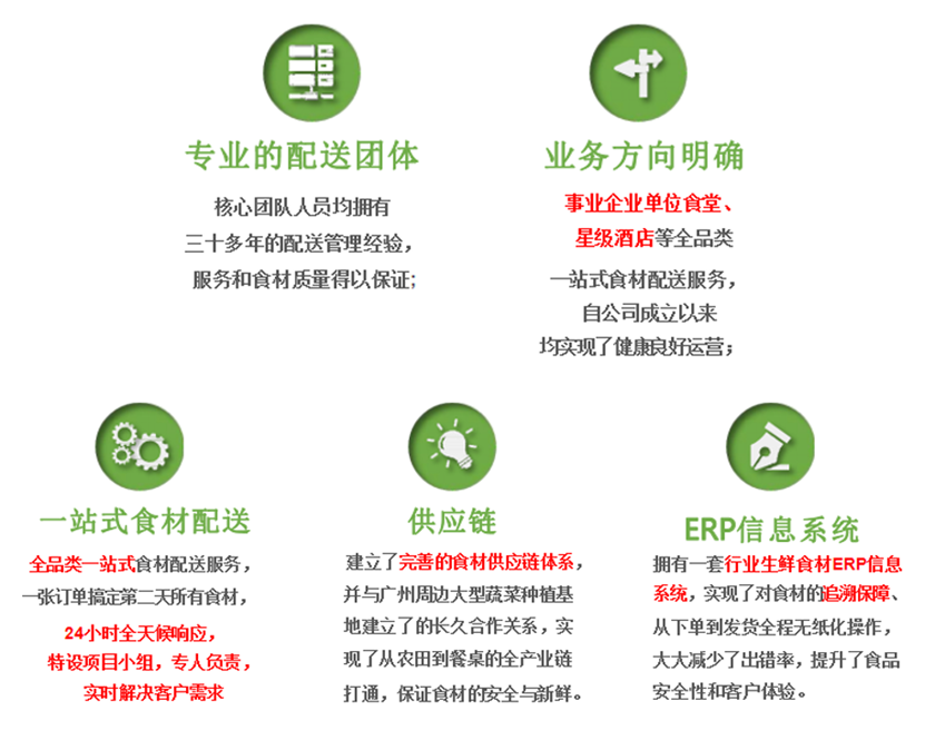 ● 我司拥有专业的多功能食材运输车辆和先进的检验检测设备,确保为客户单位提供安全、专业的食材配送服务,我司一直把食材安全放在第一位,在经营活动中,重品质、重信誉,努力为客户提供优质的产品、优质的服务。
